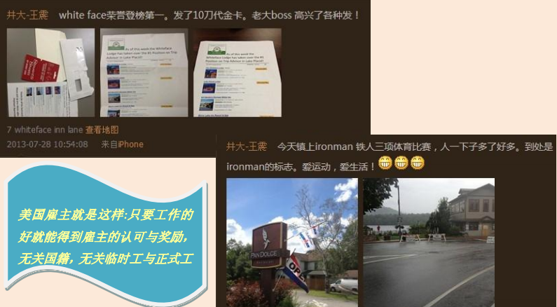 我的工作有两份:第一份是机构给我安排的Big mountain deli,后来因为一份工作比较闲,又没车不好打发空闲时间,再就是为了认识更多的人,也可以有更多的交流,于是通过朋友找到了第二份工作在Whiteface Lodge。一家是餐馆,一家是旅馆。说到deli,这是一家和国内快餐一样的餐馆,可是却雇了差不多20 个员工,大部分是像我们一样的大学生。每周Phoebe 都会把时间安排表打印出来,然后我们都是通过电脑clock in 和clock out 准时上下班的。而在White 更是严格,这就要靠自觉性了。其实住在Placid 人的自觉性都非常的高。比如交通方面,美国要求弯道车必须让直道车,车必须让人。我们在White 下班后大都是坐同事的车回家,半夜的时候路上都没车,可是文艺范来喽~ ~在弯道处同事都会停下来看路况,即使一辆车在很远的地方,她都会等车过后再走,这就是一种交通自觉吧。在Whiteface 工作的时候发现员工之间都非常的随意的,从第一天工作的时候我就喜欢了这家旅店。从进入旅馆,向你迎面而来的每一个员工都会say hello 或How areyou? 各种打招呼,无论你认识与否,而在我工作的Laundry room 就更是自由了,放着音乐,有些活泼点的员工还会跳起舞来,气氛都非常的活跃和轻松。“You are important, everyemployee is important ”这是给我们入职培训的时候一位经理Rachel 跟我们说的。“Everyone has his ownthings todo , if you areabsent ,no one can do your work , so you are very important……”这就是一种对员工的尊重,所以越来越喜欢这里了。还有一件小事,就是我们的经理(Lynn)有天上班,因为人手不够,叫我去帮下忙,干完后她连续跟我说了好多句“I’m sorry ,Cyril , but I have no idea .” 第二天一见面,又跟我说sorry ,搞得我都不好意思了。这就是一种企业文化,同时也是我们的处事原则。尊重、礼仪,我不知道这两个方面我平时做的怎么样,不过我都尽力在向文明靠拢了。