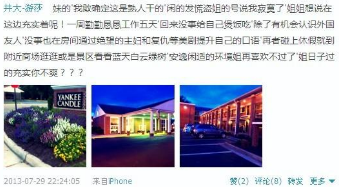 在这里生活一个月,还没有开始真正的旅游,可是却已经喜欢上这里。我想在这里留学(这个想法冲动但却真实)我想再进一步认识美国,可是有点不切实际,从财力和能力上都还不可以。现在我只想要好好再提高我的英语还有各方面的能力,因为感觉自己太缺乏了。刚来这里的时候,记得打得第一通电话是给打给订的宾馆的电话,发现自己的听力和口语都烂到家了,我不能听懂她,她不能理解我。当时就感觉到一种羞耻。现在感觉好点了,可是却还是感觉到蹩脚。让我这个英语专业的学生都自惭形秽。我要加油了。
