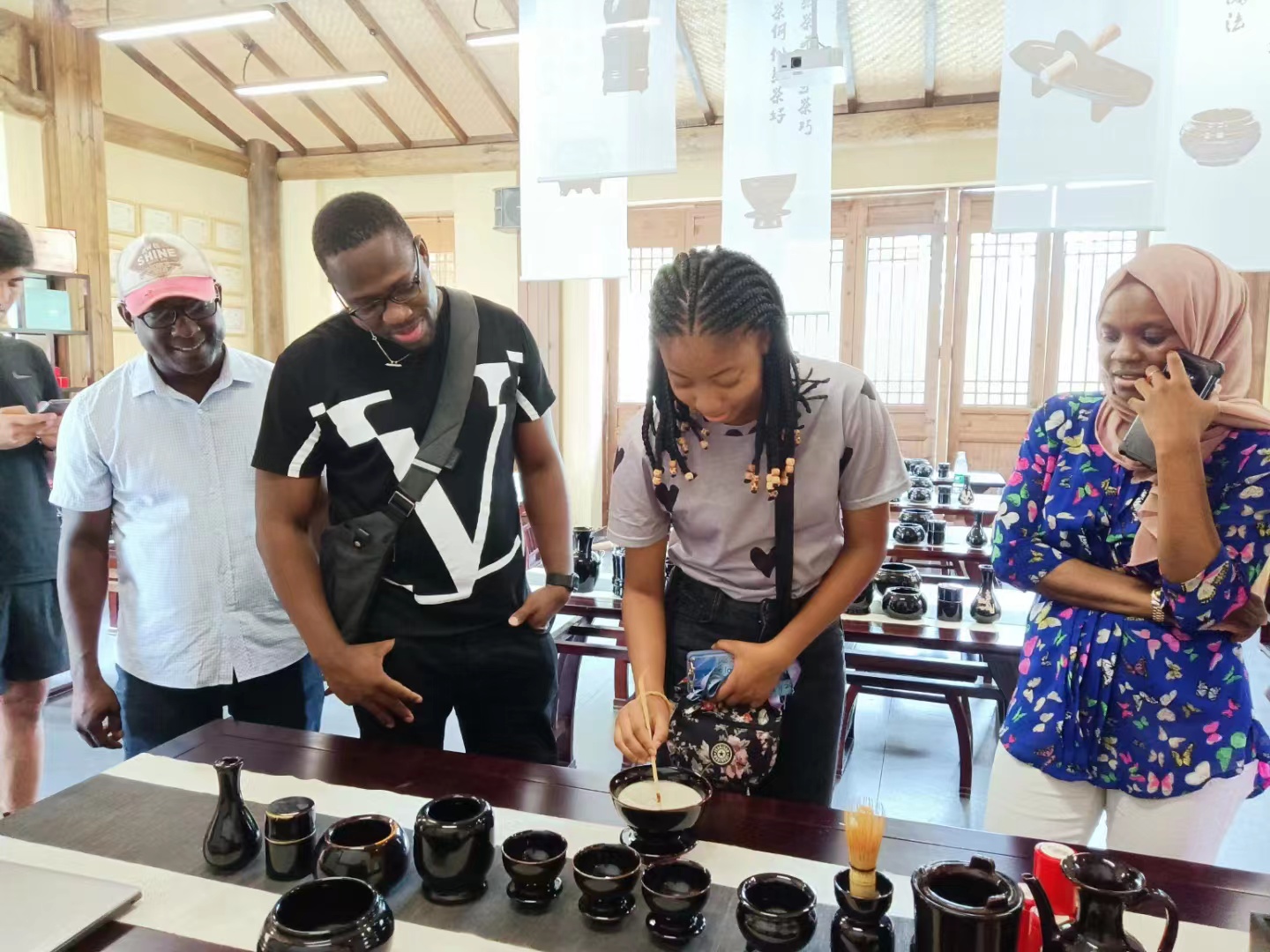 来到永和吉州窑古茶陶瓷博物馆,讲解员生动讲述了吉州窑发展历史和被列为非遗项目的吉州点茶文化。此前外国友人大对景德镇陶瓷更为熟悉,在博物馆馆长解释“先有吉州窑、后有景德镇”的历史缘由后,大家纷纷对吉州窑陶瓷竖起大拇指。在观摩点茶师的点茶演示后,外籍师生们争饶有兴趣地在茶水中或是写上自己的中文名,或是或是画下一朵莲花。