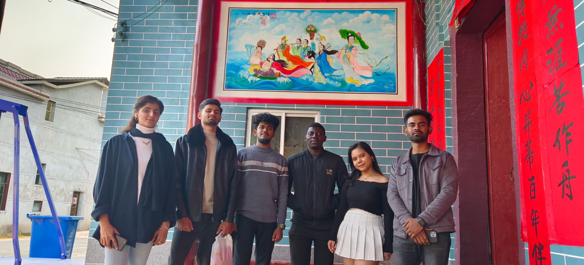 经过下东营村祠堂,留学生被祠堂两旁两幅手绘画“八仙过海,各显神通”和“富贵花开”所吸引,在听完老师对绘画作品进行解释后,留学生们纷纷表示,中国成语和中国文化博大精深,这样的学习方式令人印象深刻,收获满满。