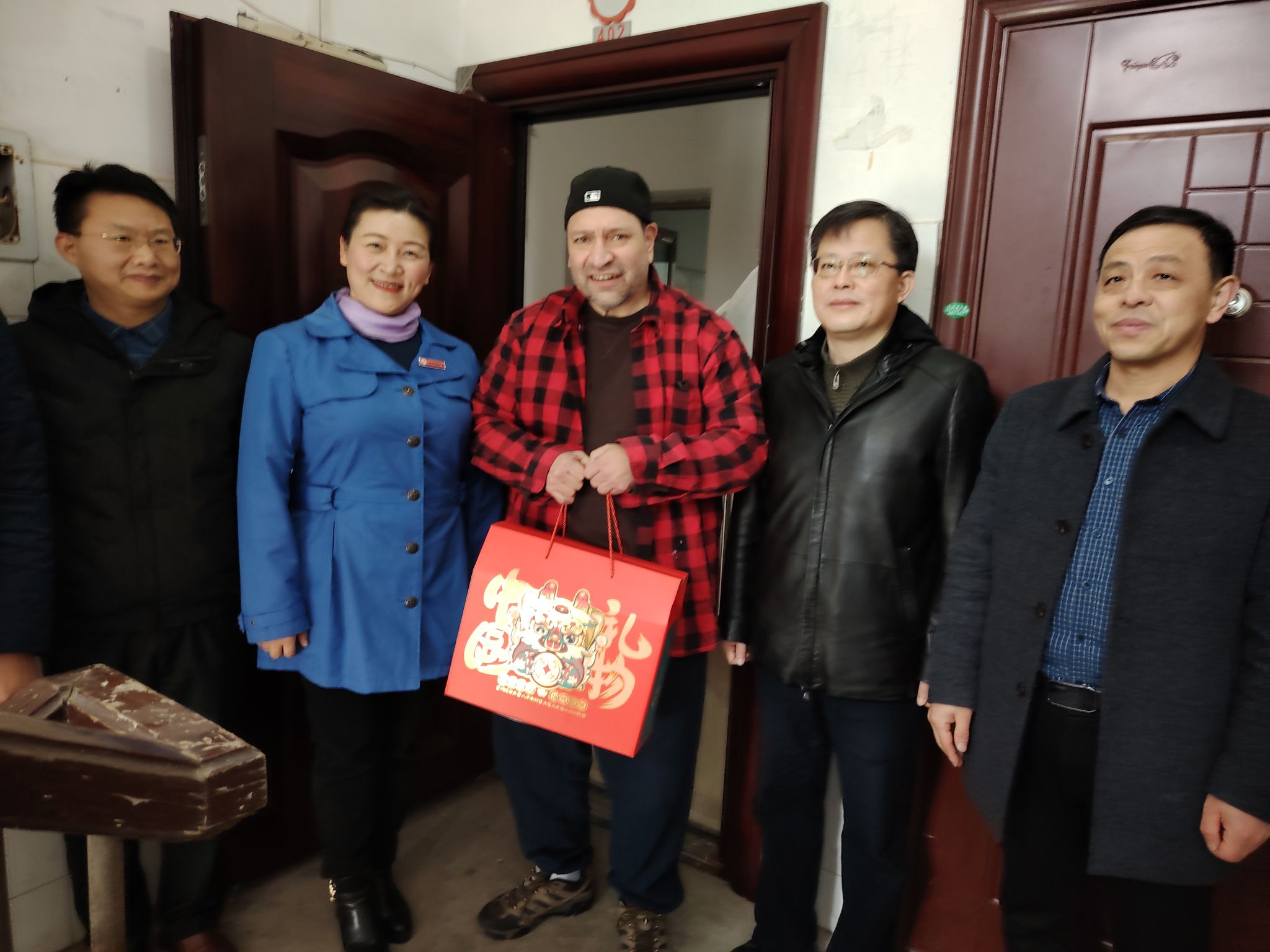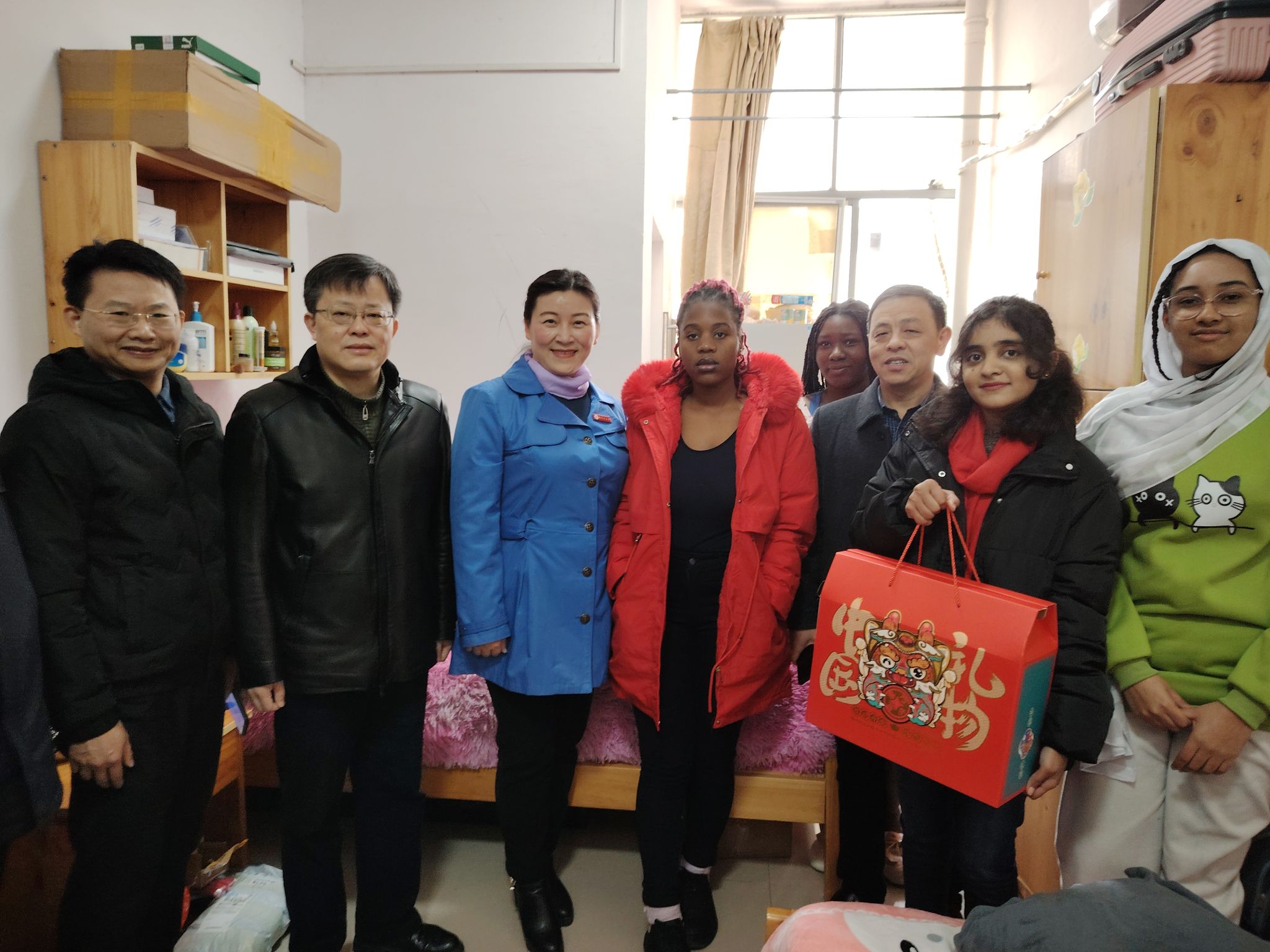 廖岚一行还来到留学生宿舍,走访慰问留学生代表,并给留学生送上了新年大礼包。在老师的带领下,留学生们自己动手在宿舍大门口挂起红灯笼,贴上喜庆的春联和“五福临门”窗花。廖岚十分关心留学生寒假期间的学习和生活,勉励大家充分利用假期时间进一步学好知识,提高安全意识,注意宿舍用电安全,并祝愿大家在井大度过一个开心、快乐的中国年。