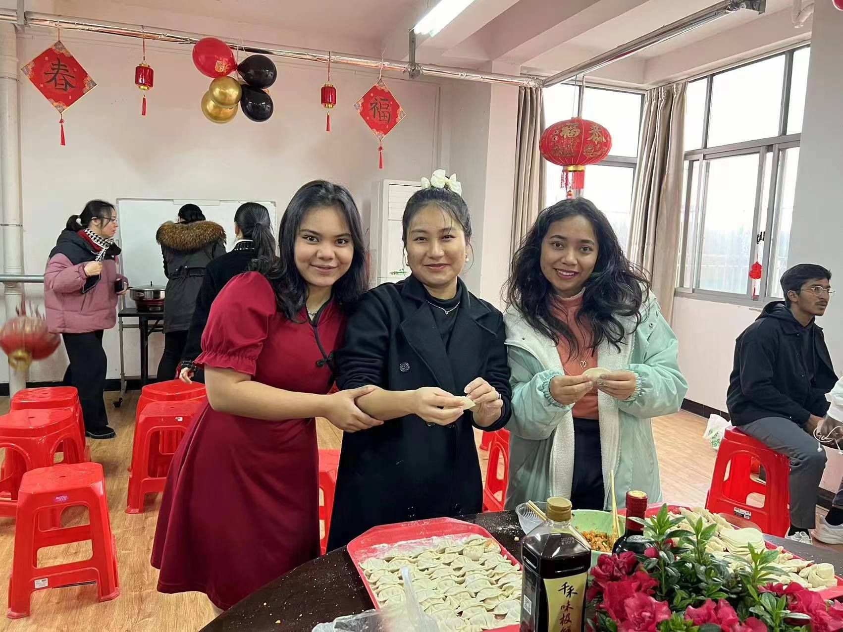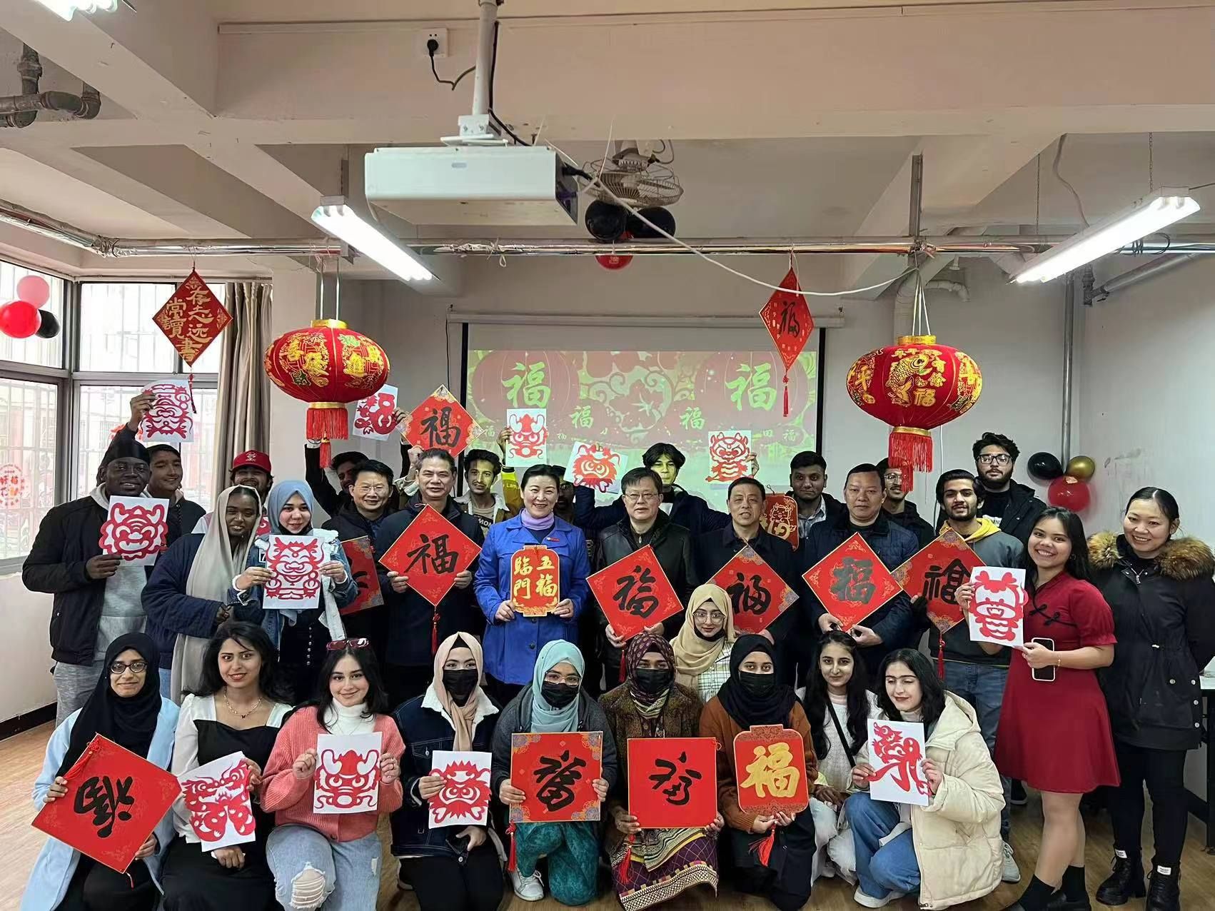 学生活动室里,留学生们正在剪窗花、包饺子,很多刚刚入学不久的新生正在贴上给自己的“新年快乐”、“心想事成”、“吉祥如意”、“龙年大吉”等新年愿望。廖岚一行与30多名留校留学生代表一同交流互动,最后,她祝福留学生们在新的一年,能够龙行龘龘、前程朤朤、生活䲜䲜。