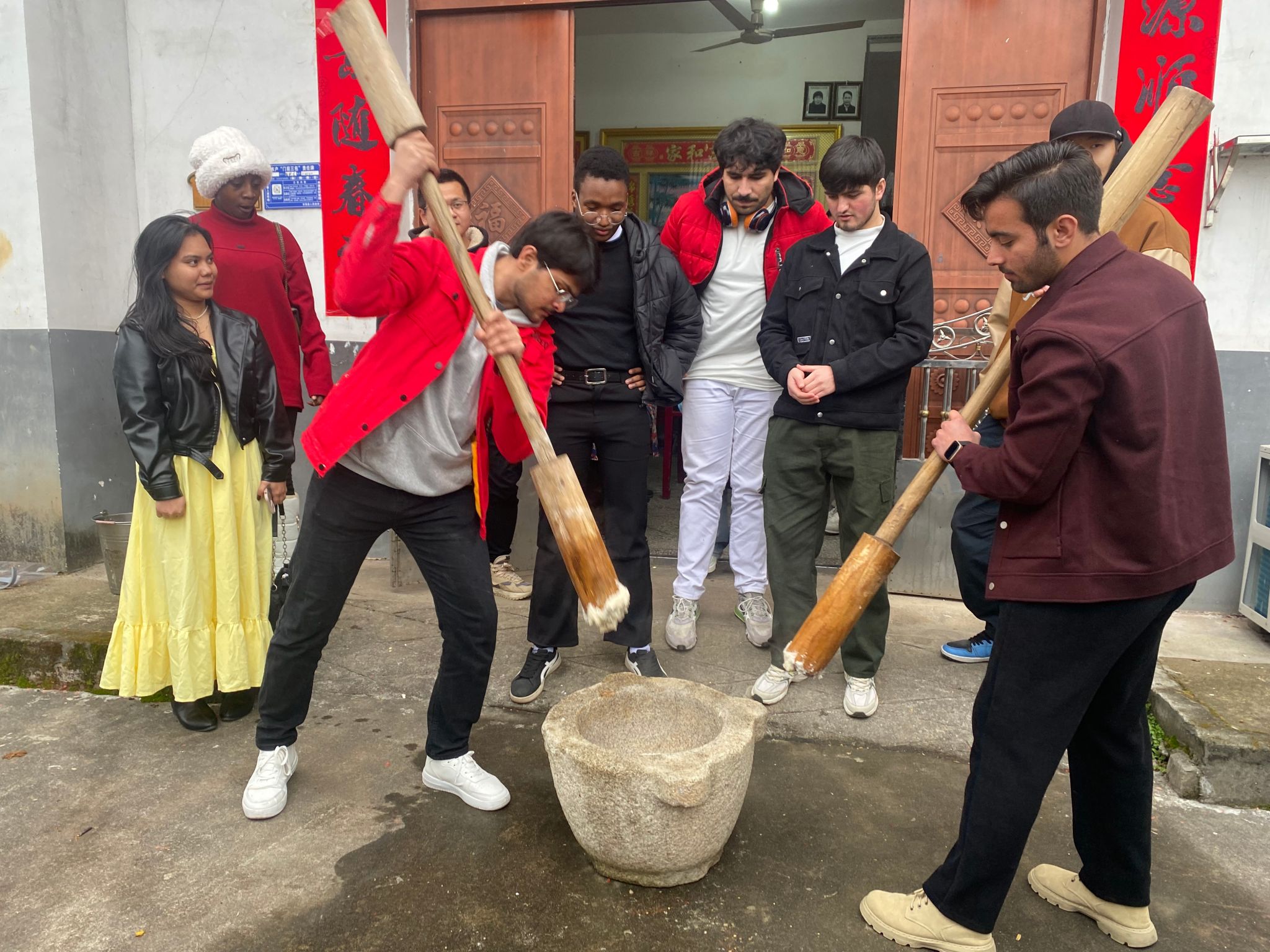 告别表嫂们后,留学生们来到羊狮慕镇体验打糍粑,留学生们学着村民的样子,手握木杵,在有节奏的捶打下,糯米逐渐变成软糯的糍粑,大家在热气腾腾与香气四溢中分享着自己的劳动成果,感受着中国农耕文化和饮食文化中蕴含的浓浓烟火气。