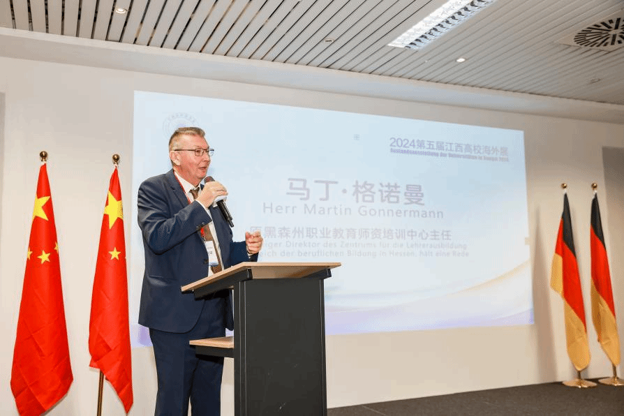 10月21日上午,2024江西高校海外展(德国站)开幕式暨江西高校与德国高校对接会在德国法兰克福举行。江西省教育厅国际处吴佐文处长主持开幕式。德国黑森州职业教育师资培训中心原主任马丁.格诺曼,弗朗恩霍夫安全信息技术研究院专职研究员安.卡特林.里德尔受邀出席活动并做主旨发言。