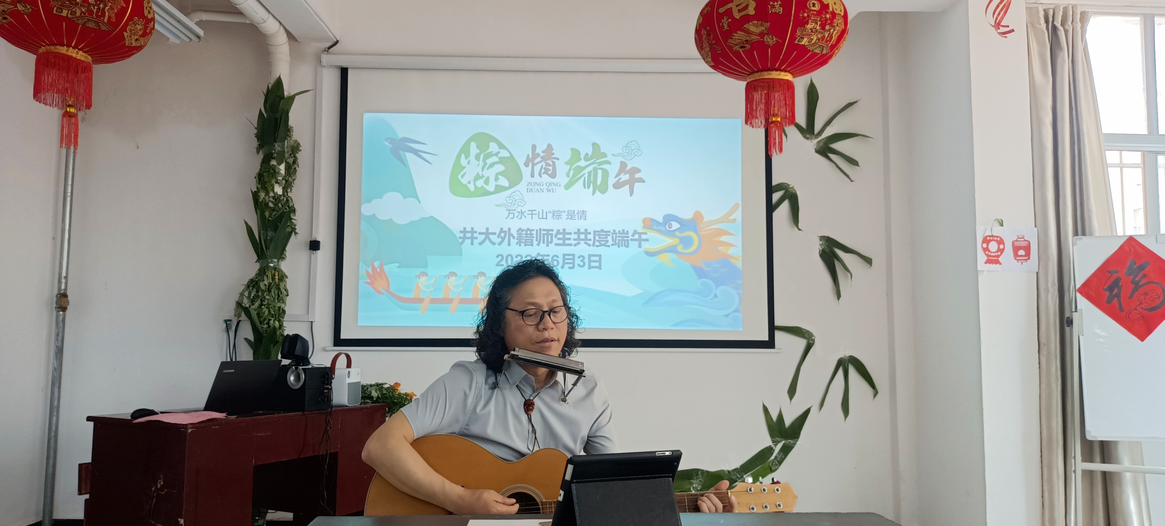 活动中韩国籍画家柳时浩教授讲述了韩国端午祭与中国端午节之间的异同后,为我们献上了一场别有韵致的视听享受。他边弹吉他边吹口琴,演唱了脍炙人口的英文歌曲《You raise me up》。音乐是没有国界的语言,在柳时浩教授动情的歌声渲染下留学生安娜、法比、外籍教师艾伟华和特邀嘉宾梁华老师等积极演绎了一场中外师生歌曲串烧,活动的高潮层层迭起。最后,国交处张长龙老师和留学生安娜共唱《我和我的祖国》,将活动推向更高潮。大家自由自在地跟着哼唱,彼此传递着美好祝愿。