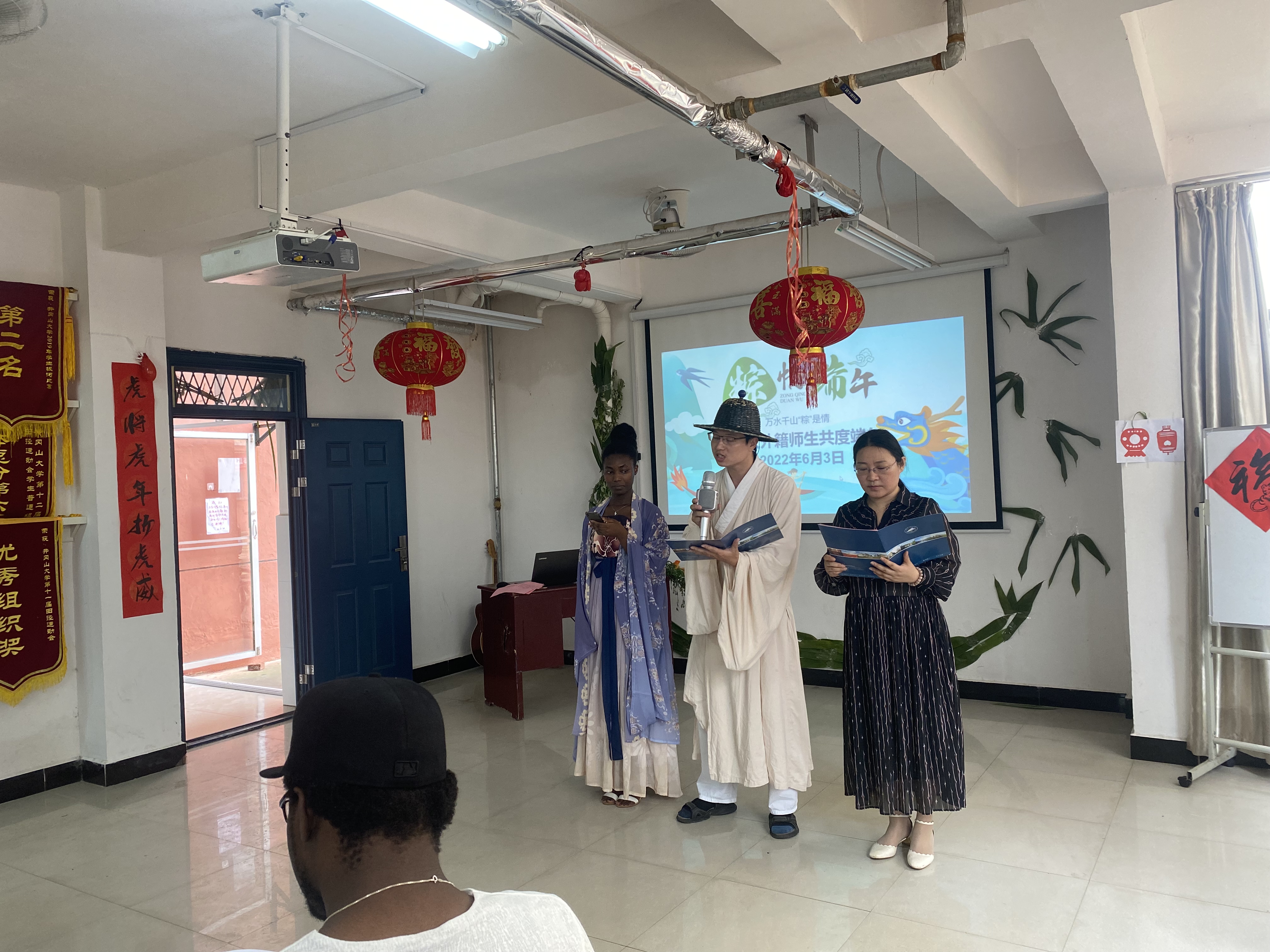 在经典诗歌朗诵环节,5位留学生演诵了《木兰诗》;特邀嘉宾吉安市朗诵与语言艺术协会副主席梁华为外籍师生诵读《生死交响——屈原颂》;人文学院陈文亮博士、国交处刘雪昶老师、国际学院留学生法比分别用“宫商角徵羽”五音吟唱、现代汉语、英语诵读了屈原的《九歌.云中君》。他们用瑰丽的诗歌引领着在场的师生一起感受中华民族伟大的爱国主义精神,缅怀先人,珍惜当下。