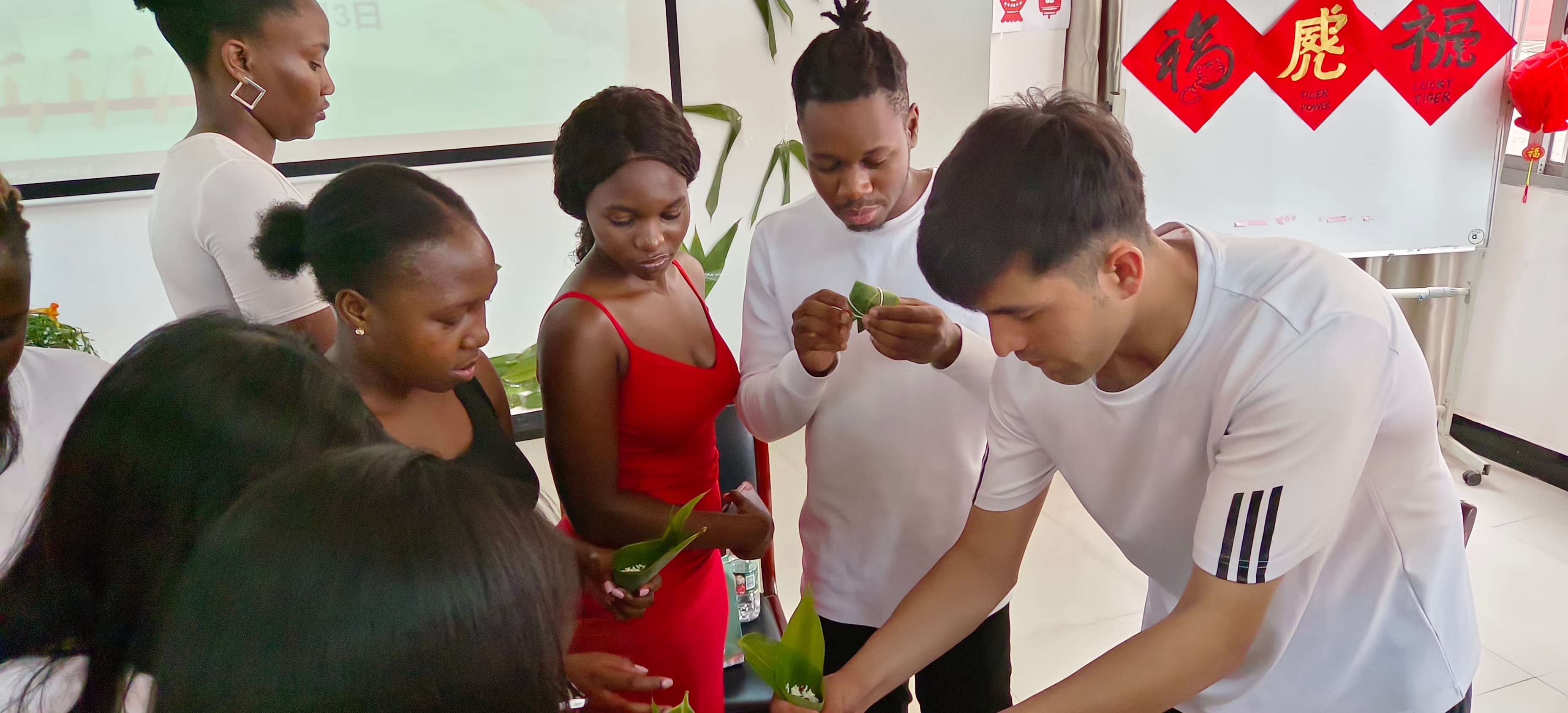 “五色新丝缠角粽。金盘送。生绡画扇盘双凤。正是浴兰时节动。菖蒲酒美清尊共。”粽叶飘香,又是一年五月五。为了让在校外籍师生了解端午节的由来和习俗,体验端午节文化精髓,6月3日上午,国际合作与交流处组织外籍师生开展了“‘粽’情端午,品读文化”的主题活动。活动由节日介绍、诗歌朗诵、歌曲串烧和包粽子四个部分组成。