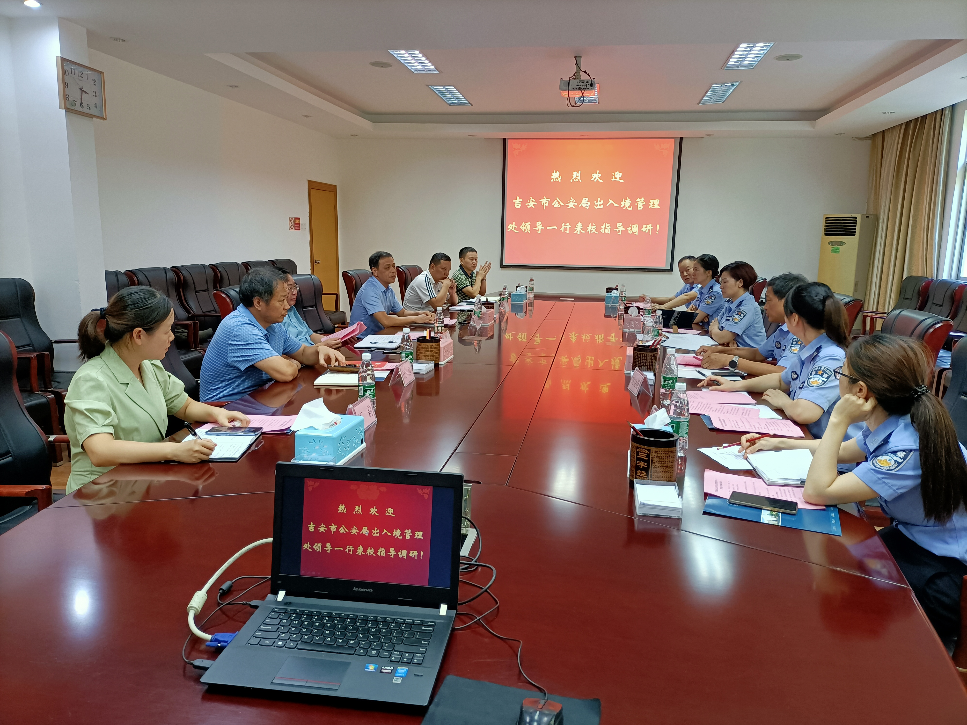 9月17日下午,吉安市公安局出入境管理处处长易锐一行来校调研交流,市公安局青原分局副局长欧阳钧以及出入境管理科科长姚小燕陪同调研。校党委常委、副校长陈小林出席并主持调研座谈会,国交处领导班子成员和有关科室负责人参加座谈。