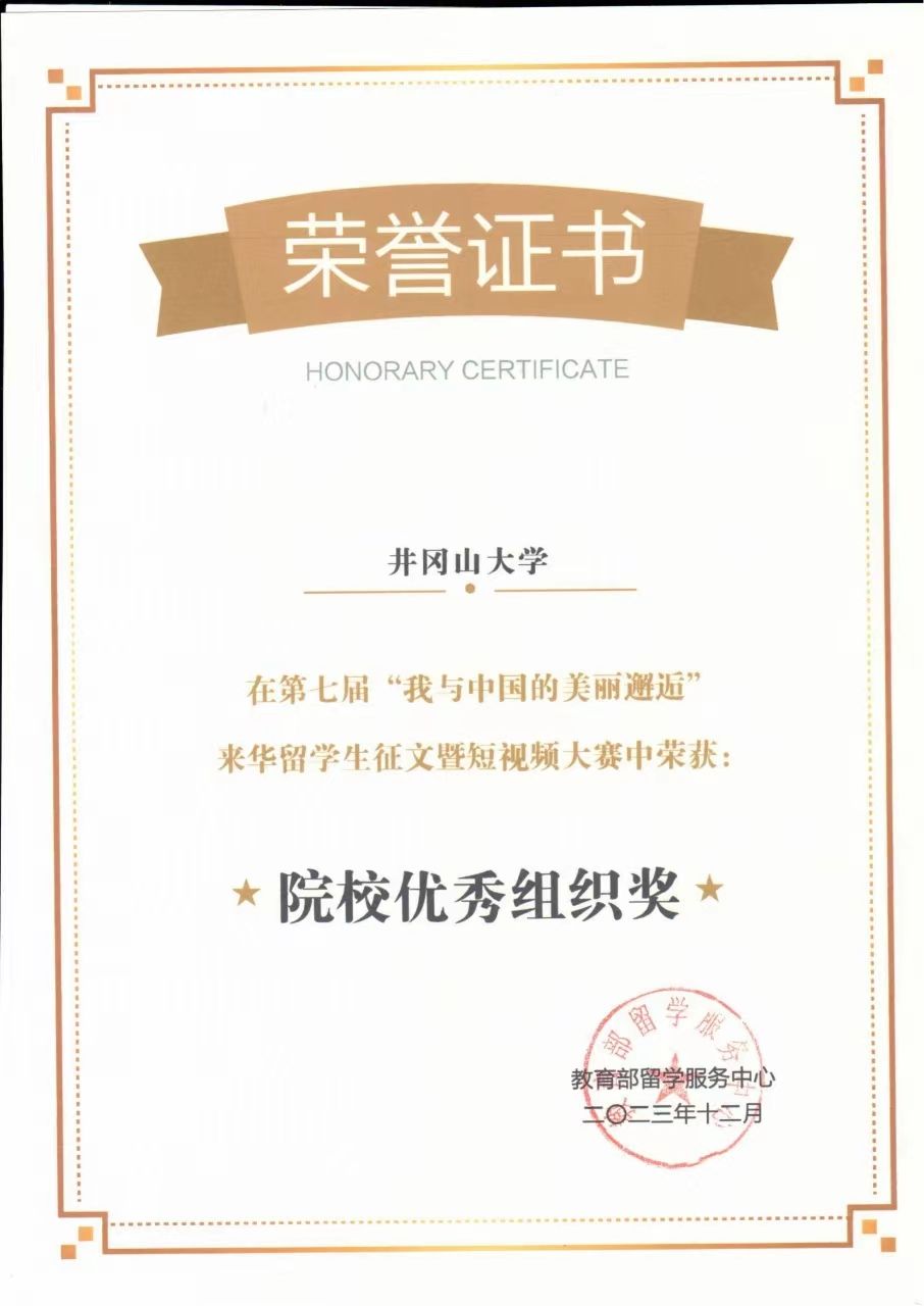 近日,教育部留学服务中心发布评选结果,我校在第七届“我与中国的美丽邂逅”来华留学生征文暨短视频大赛中,荣获“院校优秀组织奖”。这是我校首次在此项赛事中获奖。
