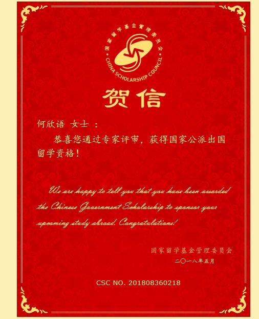 近日,国家留学基金委发来贺信,祝贺我校商学院2014级会计专业优秀毕业生何欣语同学荣获2018年度国家公派硕士研究生项目的出国留学资格,于今年下半年赴英国著名高等学府约克大学攻读项目分析金融与投资专业的硕士学位。这是我校学生首次获得国家公派硕士研究生项目的资助,国家留学基金委将为其提供在英国留学期间的基本生活费及往返国际旅费。