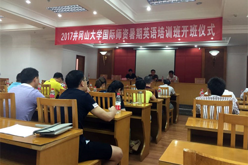 7月25日上午9点,井冈山大学国际学院在井冈山北苑宾馆举办2017年暑期国际学生师资英语培训班开班仪式,出席开班仪式的有国际学院院长苏小河、副院长杜成及副院长梁斌。开班仪式上,院领导对此次师资培训工作作出安排,并向学员强调上课纪律及安全,提出学习要求。参加本次培训的人员共计24人,他们分别来自建工学院、医学部、井大附属医院、市中心人民医院等单位。承担此次培训的两位外籍授课教师,分别从专业和语言角度对学员进行医学英语培训。通过为期5天的学习,学员的英语水平取得了一定的进步,其国际学生见习带教水平也得到了相应的提高。