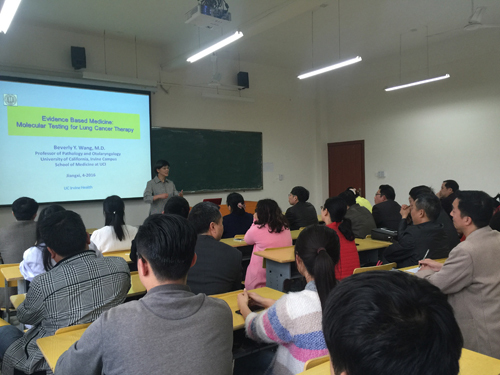 受聘仪式结束后,王依瑶教授为医学部师生作了题为《循证医学的临床应用-分子生物学的鉴定对肺肿瘤的治疗》的精彩报告。王教授从肺部肿瘤这一全球重大疾病负担的相关危险因素谈起,系统地介绍分子生物学鉴定对肺部肿瘤的循证诊疗方法,在讲座中运用大量鲜活生动的案例分析及病理切片资料,探讨了分子生物学鉴定在肺部肿瘤诊疗的国外应用现状及对疾病预后的影响,让在场师生受益匪浅。
