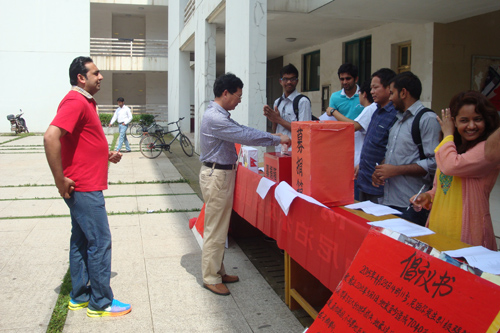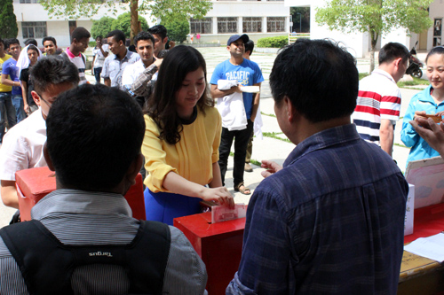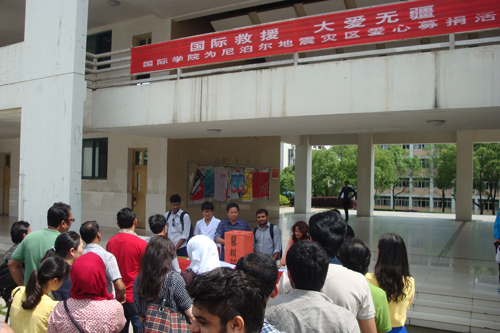 国际学院还在校团委、学生会的大力支持下,在校内发起募捐活动,5月7日下午14:00,国际学院在九号教学楼广场组织了主题为“国际救助,大爱无疆”的为尼泊尔地震灾区献爱心募捐活动。学院领导、教职工、外籍教师、来自20个国家的部分留学生及部分中国学生参加了此次爱心捐款活动。一方有难,八方支援,大家纷纷慷慨解囊,当场筹集善款4402.5元。所有善款将通过有关途径全部汇至尼泊尔地震灾区。