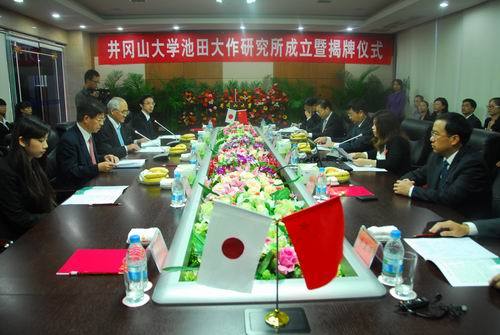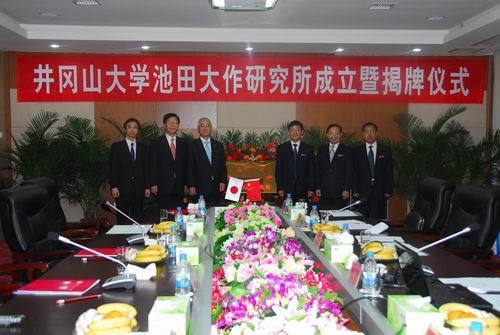 10月29日,井冈山大学池田大作研究所成立暨揭牌仪式在校隆重举行。受日本创价大学创办人池田大作委托,日本创价大学校长山本英夫专程来校出席揭牌仪式。创价大学世界语言中心教授汪鸿祥,国际部主任堀口真吾以及日本圣教社记者随同。校长张泰城和山本英夫为井冈山大学池田大作研究所揭牌。副校长曾建平主持,副校长肖长春出席。我校国际合作与交流处负责人、外语学院负责人以及日语教师、日语外教和日语学生代表等40余人参加了仪式。